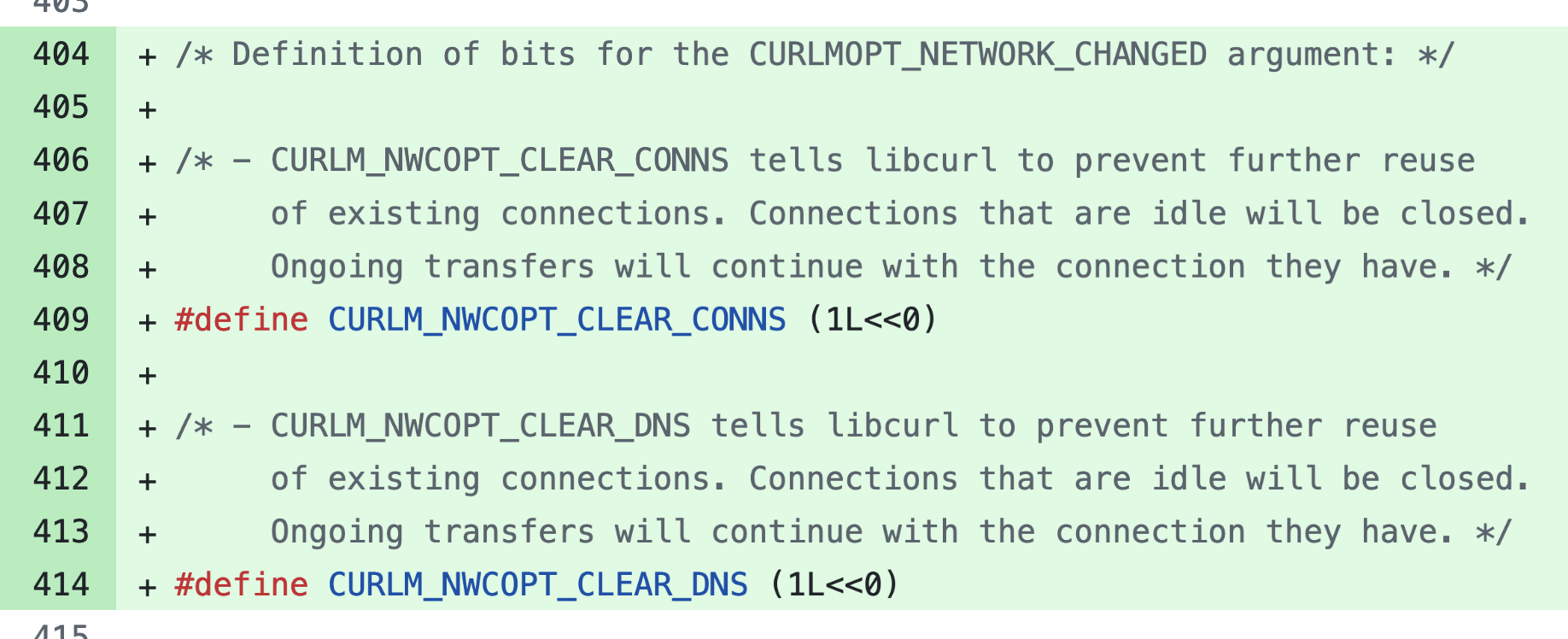 CURLMNWC_CLEAR_DNS and CURLMNWC_CLEAR_CONNS were both defined as (1L << 0) (or just 1) , so you could never clear just DNS or just connections - always both.
